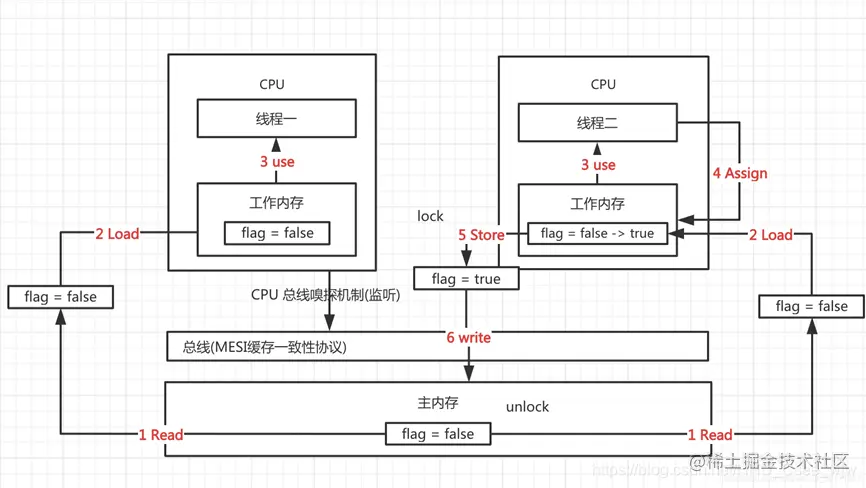 上图,线程一把flag属性读取到线程私有的本地内存中,值为false;线程二把flag属性修改为true,并且刷新到主内存当中,但是线程一不知道flag被修改了。