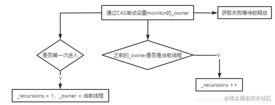 3 若当前线程是第一次进入,设置_recursions = 1,_owner = 当前线程,该线程成功获得锁并返回。