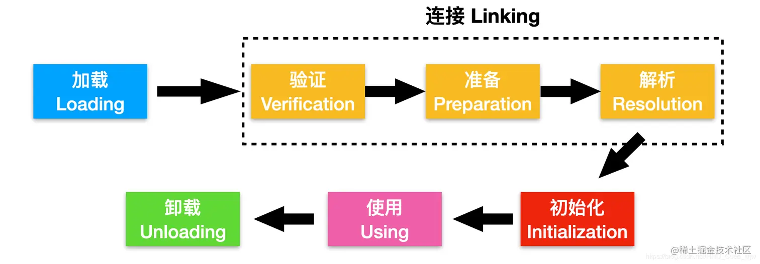 类从加载到JVM到卸载一共会经历五个阶段:加载、连接、初始化、使用、卸载。这五个过程的执行顺序是一定的,但是在连接阶段,也会分为三个过程,即验证、准备、解析阶段,这三个阶段的执行顺序不是确定的,通常交叉进行,在一个阶段的执行过程中会激活另一个阶段。