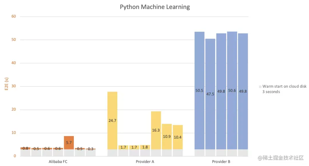 以云盘热启动为基准(灰色),对比各个厂商的额外开销(彩色)