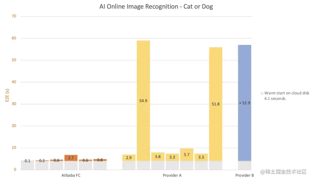 以云盘热启动为基准(灰色),对比各个厂商的额外开销(彩色),绿色部位为优于基准线的端到端耗时