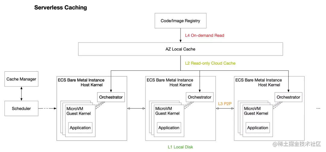 在设计下一代架构时我们不仅考虑解决冷启动频次问题,也同样注意到缓存对于启动时延的影响。于是我们创新性的发明了 Serverless Caching,根据不同的存储服务特点构建数据驱动、智能高效的缓存体系,实现软硬件协同优化,将 Custom Container 体验进一步提升。函数计算后台神龙的更迭时间远大于 ECS VM 的闲置回收时间,对于用户侧而言,热启动频率大幅提升,在冷启动后,缓存会持续保留在神龙机器上,缓存命中率可达 90% 以上。