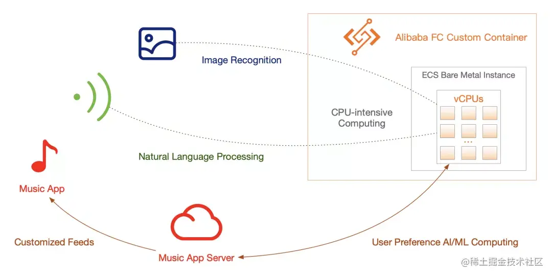 推理类计算依赖大体积底层训练框架以及大量的数据处理,普通的 AI 框架如 Tensorflow 的镜像可以轻松达到 GB 级,对 CPU 要求已经很高,要再满足扩缩容就更是挑战。函数计算自定义镜像可以很好的解决此类需求,用户只需直接使用底层训练框架镜像并与数据处理逻辑打包至新的镜像内便可以轻松省去更换运行环境所带来的移植开销,同时又可以满足弹性扩缩容带来的快速训练结果。歌曲喜好推理、图片 AI 识别分析等都可以无缝与函数计算衔接以达到弹性满足大量动态的在线推理请求。