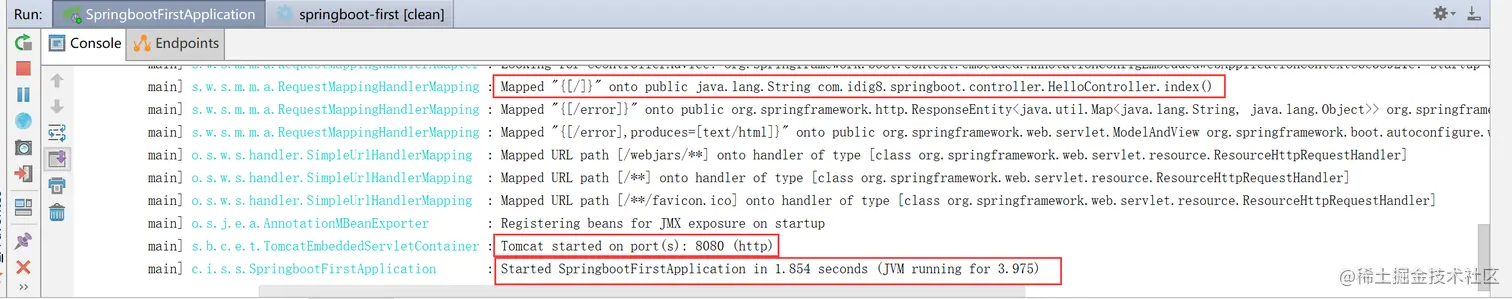 springboot 已经成功启动,端口8080 扫描到了对应/ 对应的HelloController的index方法 启动时间2秒就启动就可以了。