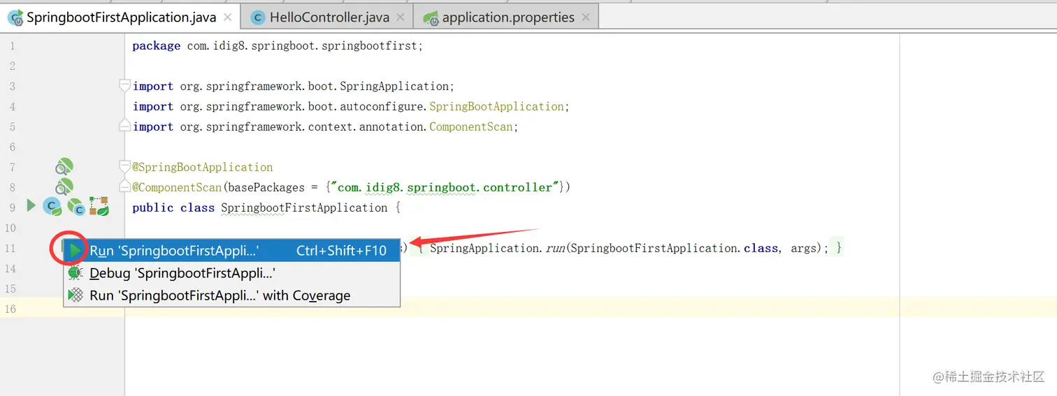 进入SpringbootFirstApplication如下图选择运行