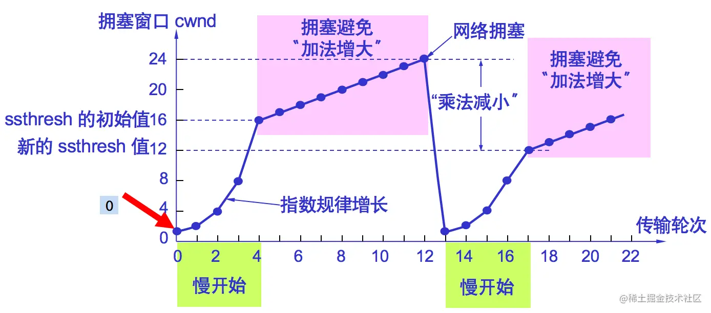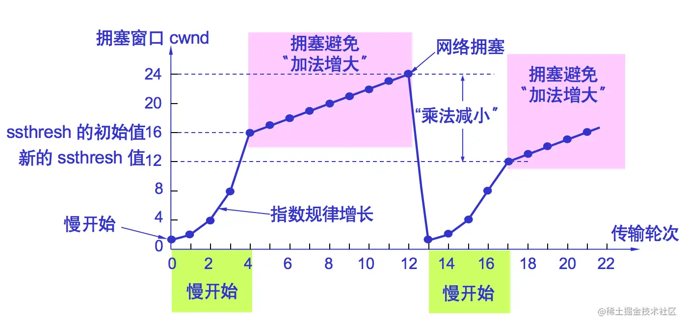 当拥塞窗口cwnd增长到慢开始门限ssthresh时(即当cwnd=16时),就改为执行拥塞避免算法,拥塞窗口按线性规律增长。