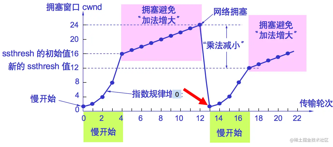 当cwnd=12时就改为执行拥塞避免算法,拥塞窗口按线性规律增长,没经过一个往返时延就增加一个MSS的大小。