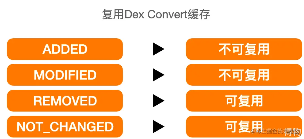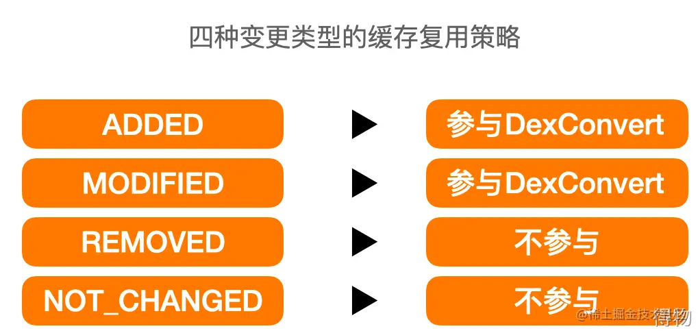 在DexConvert执行前,解压缩Jar,以.class为粒度执行DexConvert。并且只有其中变更的.class参与,未变更的.class执行结果复用上次编译缓存。具体有四种变更类型对应的缓存复用策略: 对于新增的.class,需要参与DexConvert; 改动的.class参与DexConvert; 移除的.class不参与DexConvert; 未改变的也不参与。