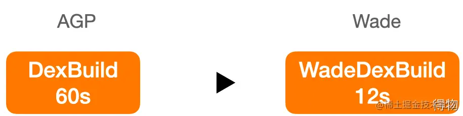 Wade Plugin通过Hook Android原生的编译流程,将原生的DexBuildTask替换为WadeDexBuild,原生的DexMergeTask替换为WadeDexMerge。原生DexBuild平均耗时60秒,WadeDexBuild只需12秒; 原生DexMerge平均耗时42秒,WadeDexMerge只需2秒。