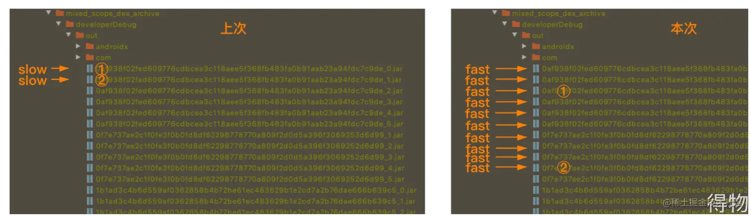 DexMerge通过合并.dex文件来降低APK内Dex文件数量和体积,提升安装速度和首次运行速度。原生DexMerge的缺点是不支持增量编译,耗时和Dex文件数量成正比,得物项目的DexMerge耗时在30-60秒之间。