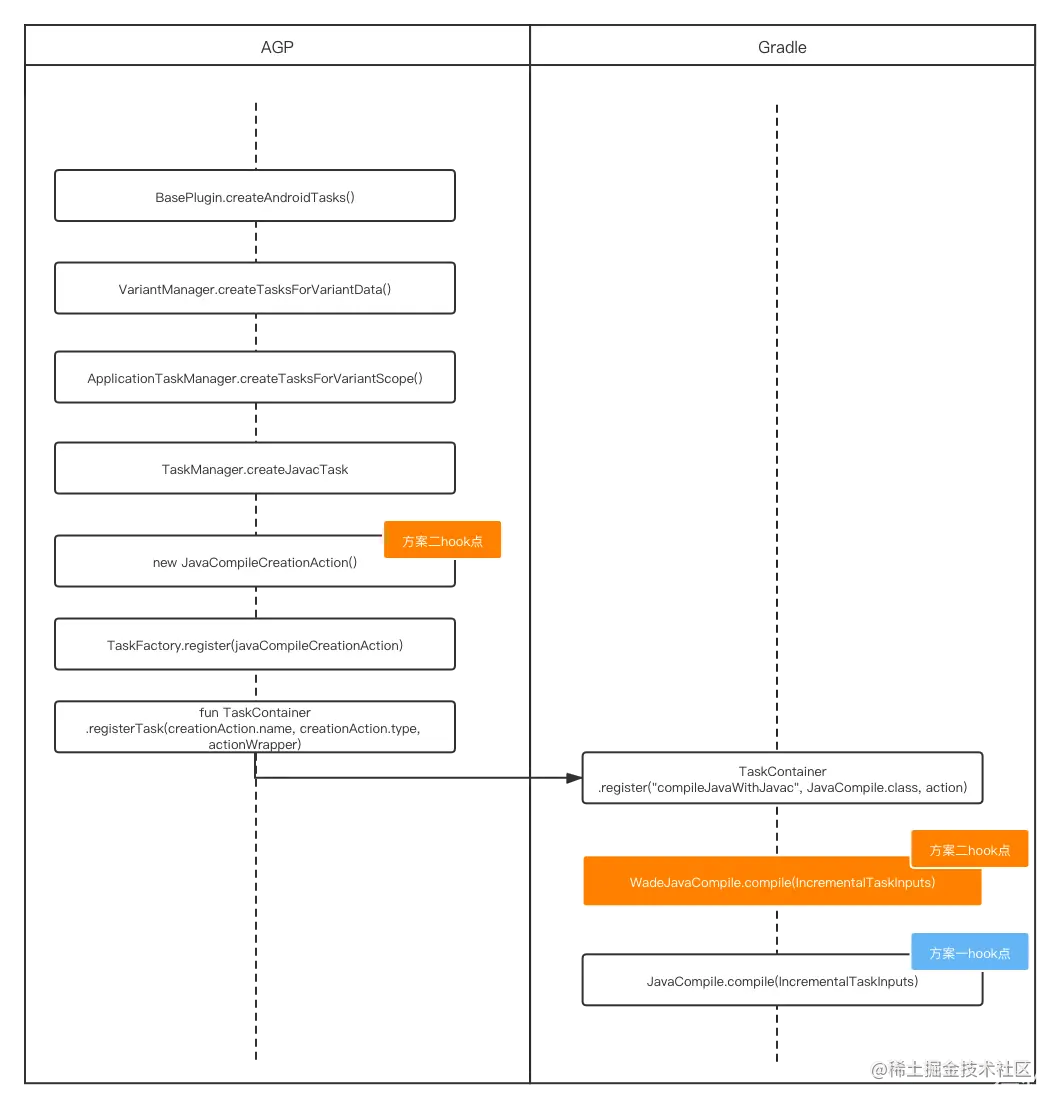 指标的计算依赖埋点数据上报,埋点中部分字段的值较难获取。例如本次编译的JavaCompileTask是否为增量,需通过对AGP和Gradle插桩实现,有三处Hook点可以切入。