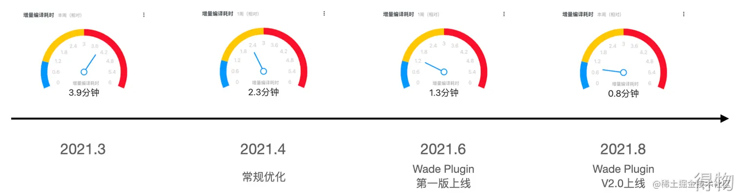 四月初通过一系列常规优化,如改造增量注解处理器、 增量Transform、组件化、工程化、优化项目配置等等,耗时缩短到2.3分钟。六月,Wade Plugin第一版上线,进一步缩短到1.3分钟。八月,Wade第二个大版本上线,最终将增编耗时降低到了0.8分钟。本文主要介绍Wade Plugin的技术原理和实现思路。