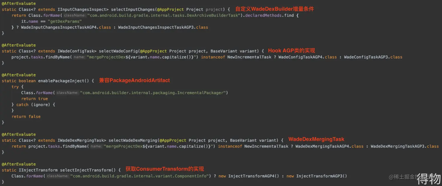 插件中的关键步骤如增量编译触发条件、反射获取Consumer Transform、WadeDexMergeTask等都针对不同版本分别做了适配。
