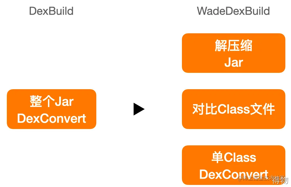 调用Dx或D8工具完成Class到Dex的转换这一过程称为DexConvert,它占了DexBuild大部分耗时。原生DexBuild以Jar和Class为粒度执行DexConvert。得物工程中平均1个Jar包含200+个.class,相当于增量时每改动一个类会触发200个类执行DexConvert。