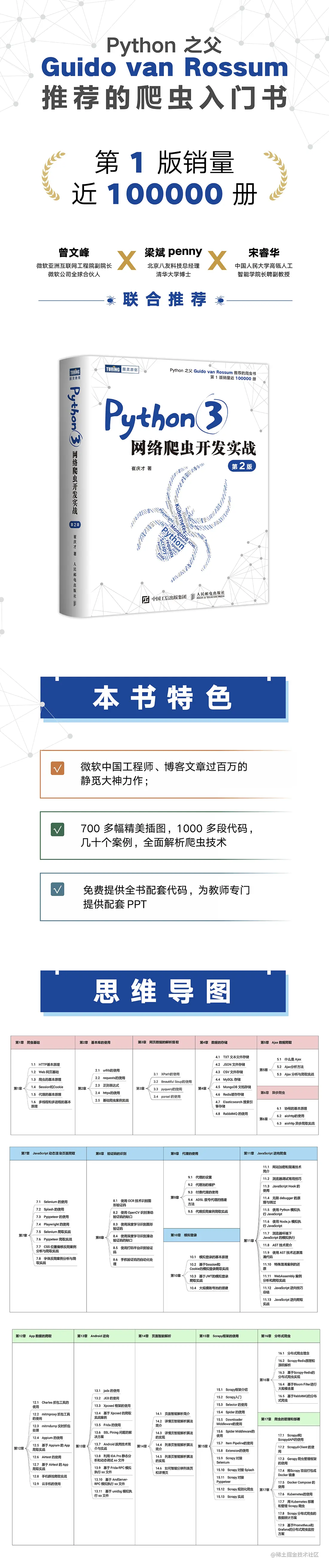 这本书同时还获得了 Python 之父的推荐(没错就是 Python 的创始人,Guido van Rossum)。另外我还有幸获得了微软亚洲互联网工程院副院长曾文峰、知名爬虫专家梁斌penny、中国人民大学高瓴人工智能学院长聘副教授宋睿华的推荐。