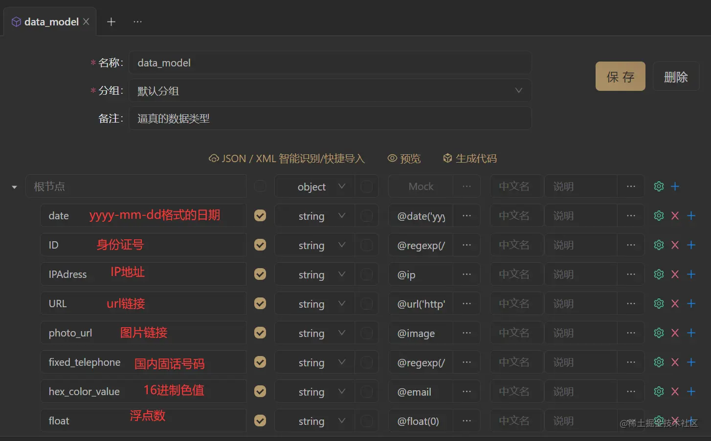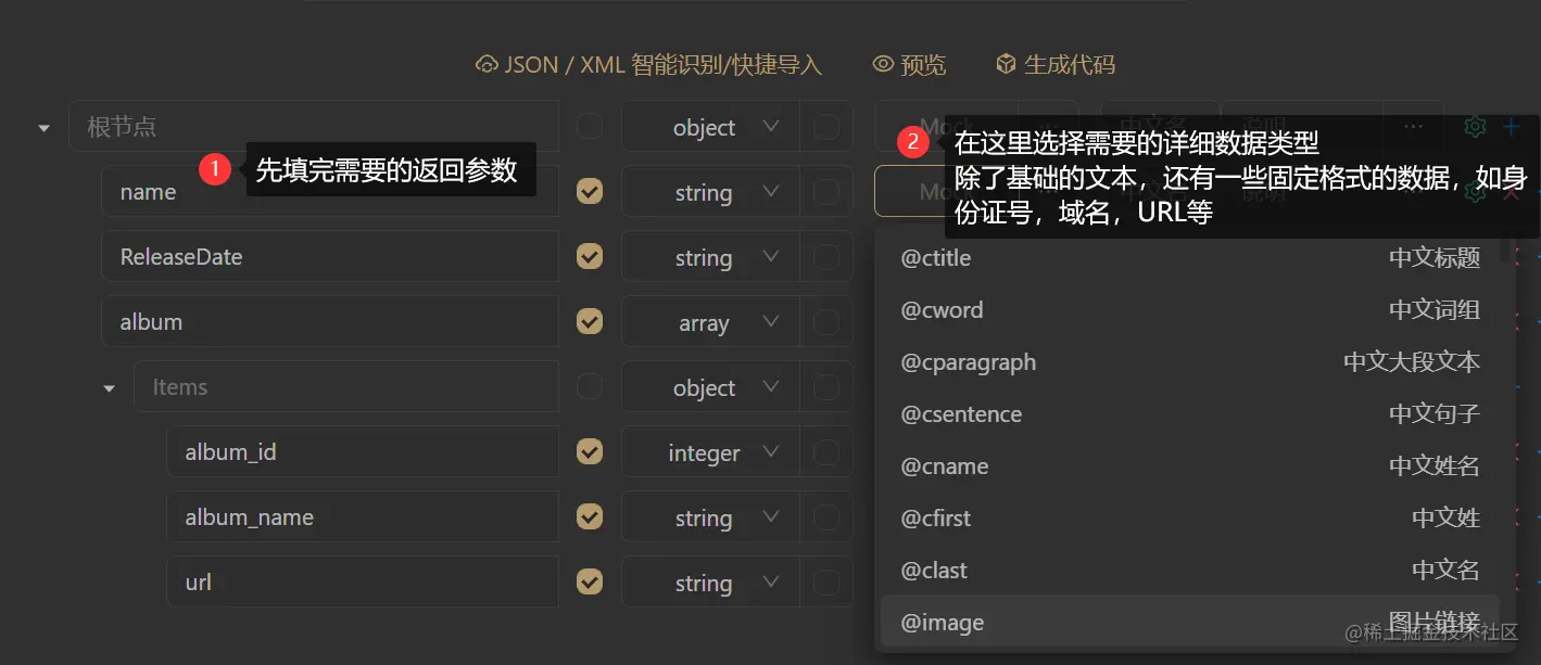 一般我是在这个软件填完返回参数后再进一步选择某类数据,apifox会自动生成符合相应数据结构要求的数据出来。
