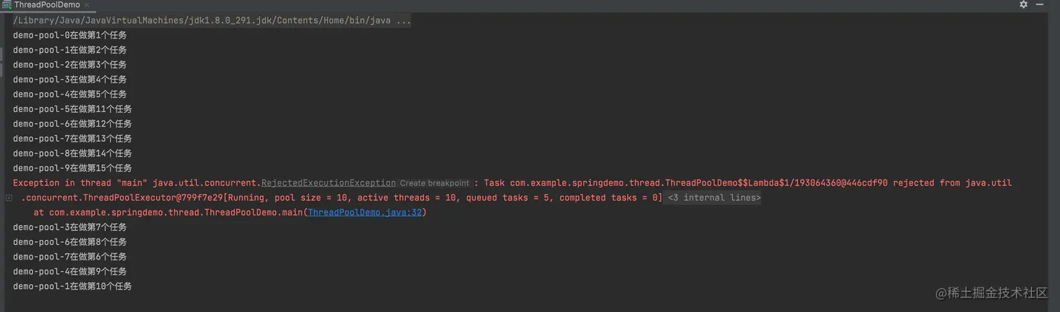 因为在抛出异常后,也没有catch进行处理,默认这个线程池就结束了,但是由于阻塞队列中还有未完成的任务,所以还会执行第6-10次任务。