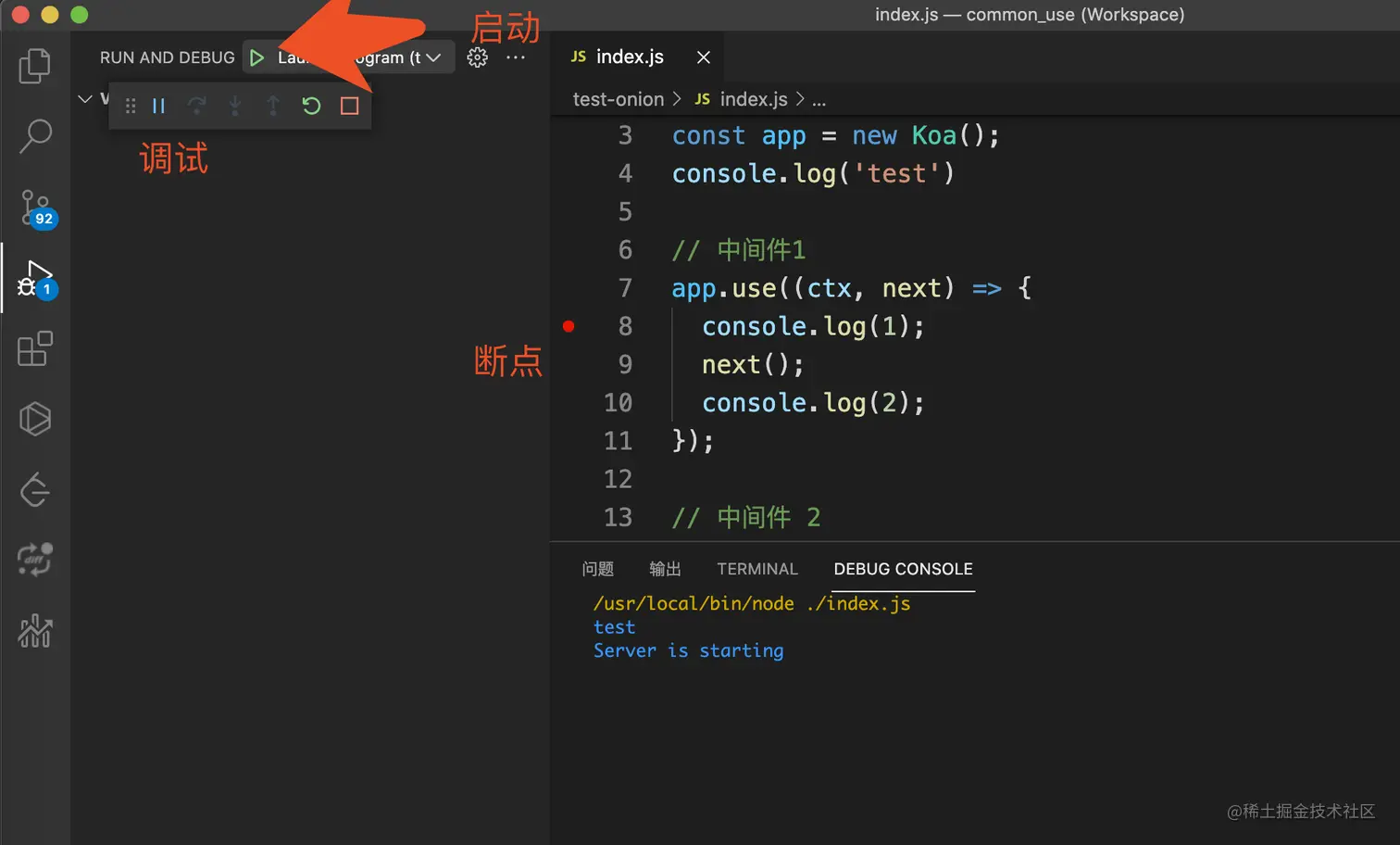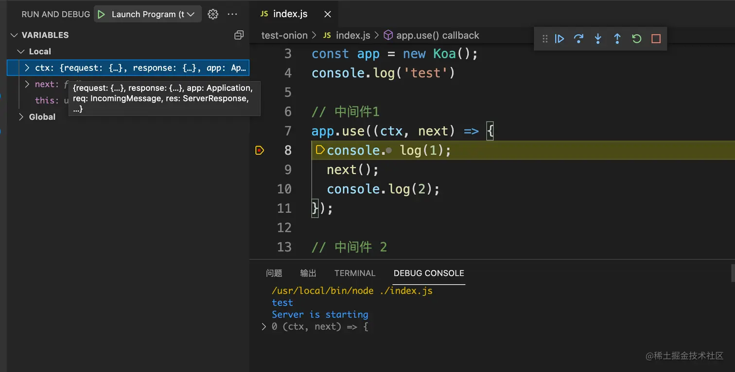 本文示例采用的是之前探索洋葱模型的,仅有一个文件,就是根目录下 index.js,如下: