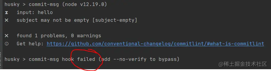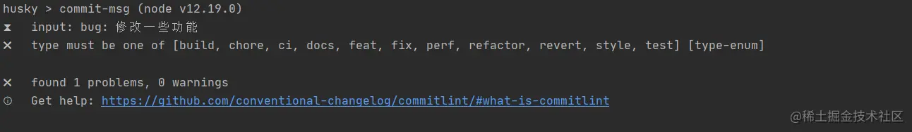 然后触发了commit-msg中配置的commitlint的检查,这里的bug并没有加到type中,所以报错