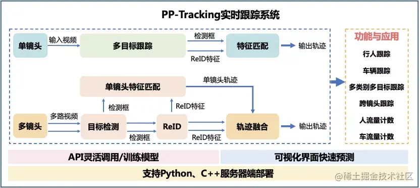 更贴心的是,PP-Tracking 支持 Python、C++两种部署语言,同时提供使用飞桨原生推理库 Paddle Inference 和飞桨服务化推理框架 Paddle Serving 的保姆级部署教程,真正意义上打通从训练、推理到部署的全流程。