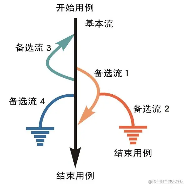 基本流和备选流:如下图所示,图中经过用例的每条路径都用基本流和备选流来表示,直黑线表示基本流,是经过用例的最简单的路径。备选流用不同的色彩表示,一个备选流可能从基本流开始,在某个特定条件下执行,然后重新加入基本流中(如备选流1和3);也可能起源于另一个备选流(如备选流2),或者终止用例而不再重新加入到某个流(如备选流2和4)。