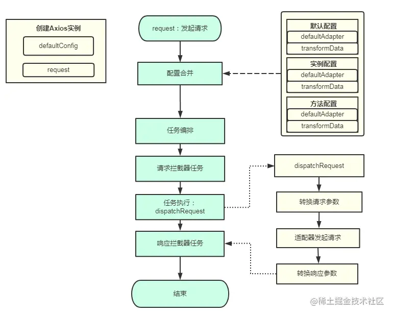 ,派发请求流程也就不往下走了。不管拦截器、或者取消请求,其实都是在触发适配器前处理,业务层不会响应底层请求适配器。这也是axios库很值得借鉴的地方,严格分层。