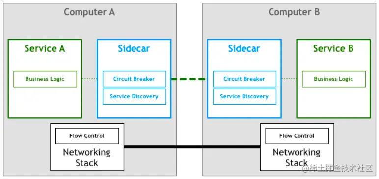 每个服务都将有一个配套的代理 sidecar,鉴于服务仅通过 sidecar 代理相互通信,我们最终会得到类似于下图的部署: