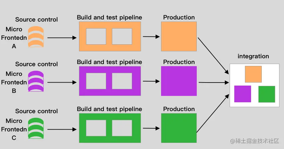 因此,每个微前端都应具备有自己的持续交付流水线(包括构建、测试并部署到生产环境),并且要能独立部署,不必过多考虑其它代码库和交付流水线的当前状态: