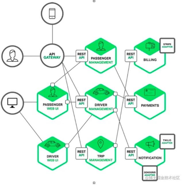 每个业务逻辑都被分解为一个微服务,微服务之间通过 REST API 通信。一些微服务也会向终端用户或客户端开发API接口。但通常情况下,这些客户端并不能直接访问后台微服务,而是通过 API Gateway 来传递请求。API Gateway 一般负责服务路由、负载均衡、缓存、访问控制和鉴权等任务。