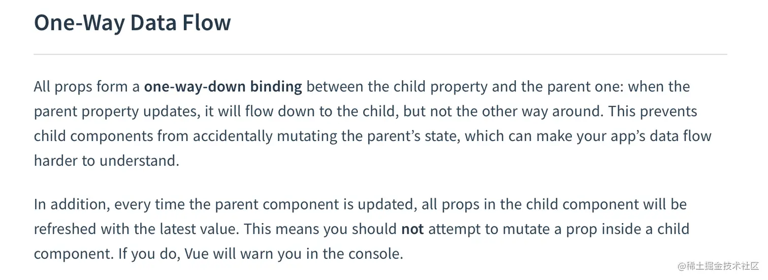 其实,你要是仔细看过 Vue 的官方文档,那么官方就已经说明 Vue 其实是 One-Way Data Flow。下面这段话来自官方
