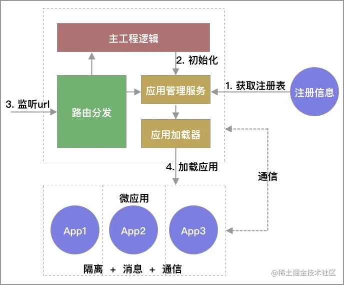 作为微前端的基座应用,是整个应用的入口,负责承载当前微应用的展示和对其他路由微应用的转发,对于当前微应用的展示,一般是由以下几步构成: