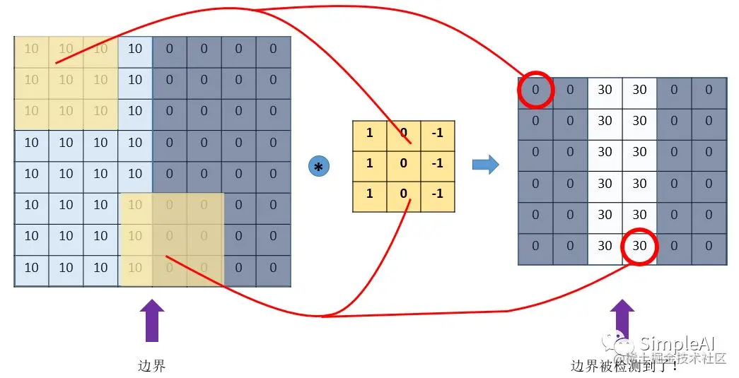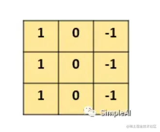 图片中的数字代表该位置的像素值,像素值越大,颜色越亮,所以为了示意,我们把右边小像素的地方画成深色。图的中间两个颜色的分界线就是我们要检测的边界。怎么检测这个边界呢?我们可以设计这样的一个 滤波器(filter,也称为kernel) ,大小3×3: