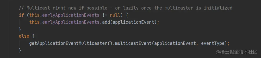 上面这段注册监听器的代码一共做了三件事情,第一件事情是容器中已有的监听器注册到多播器中;第二件事情是将Bean定义中的事件,也就是我们自己定义的监听器注册到多播器中;第三件事情是发布早期待处理事件,这些早期事件我们定义的监听器是监听不了的,这里发布早期待处理事件时通过multicastEvent()方法进行发布,这个方法会和下面一起讲。