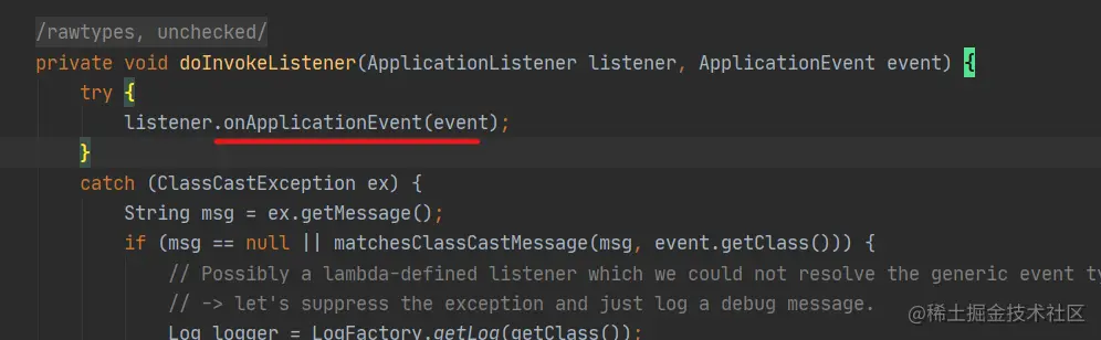 在invokeListener()方法中,终于看到了熟悉的onApplicationEvent方法,这个方法就是我们在自定义监听器时重写的方法,也正是在这里监听器调用了我们自己定义的onApplicationEvent(),实现了自定义的一些功能。