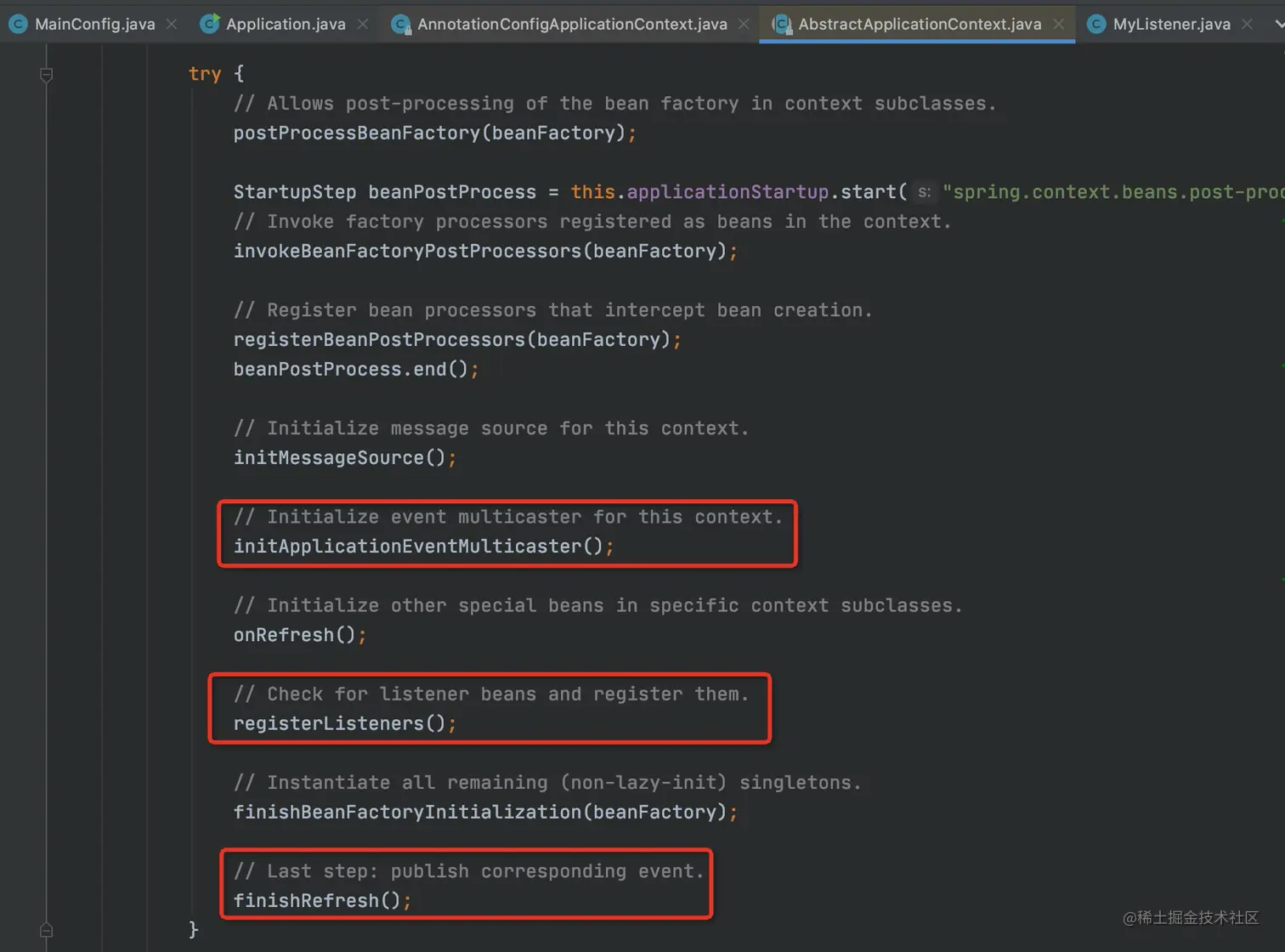 这三个方法是Spring源码的核心,和监听器相关的内容在refresh方法中。进入refresh方法,和监听器相关的三个方法是initApplicationEventMulticaster()、registerListeners()和finishRefresh();