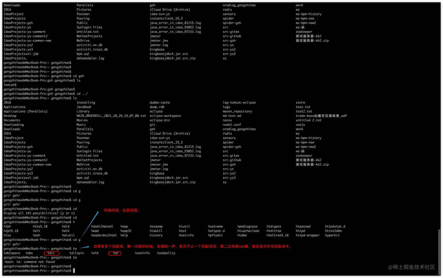 如果有多个匹配项,第一次按tab,会滴的一声;然后第二次在按tab,会显示所有匹配项——方便你从中选择一个。
