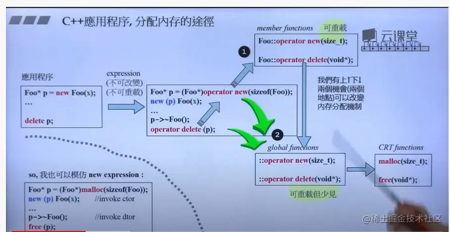 如果要对内存管理做一些操作可以重载 Foo::operator new() 函数 和 Foo::operator delete() 函数。
