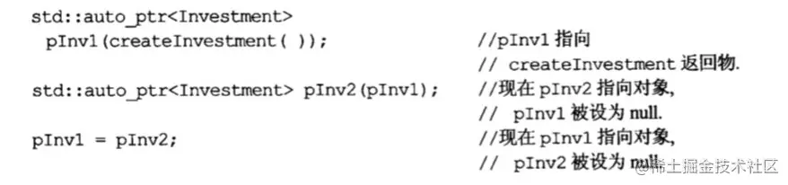auto_ptr<Investment> ptr(createInvestment()); // 1, 调用 factor 构造函数来创建 investment 对象 2, 使用 ptr 这个对象 3,在使用完后只能指针自动调用 Investment 析构函数。