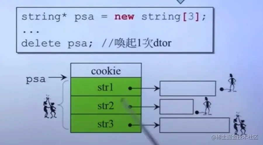 delete[] p; // 释放 p 数组,这里的中括号不能丢,带[] 调用三次 dtor