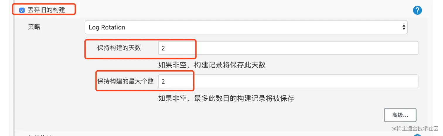 勾选丢弃旧的构建, 保持构建的天数为2天, 最大构建个数为2个