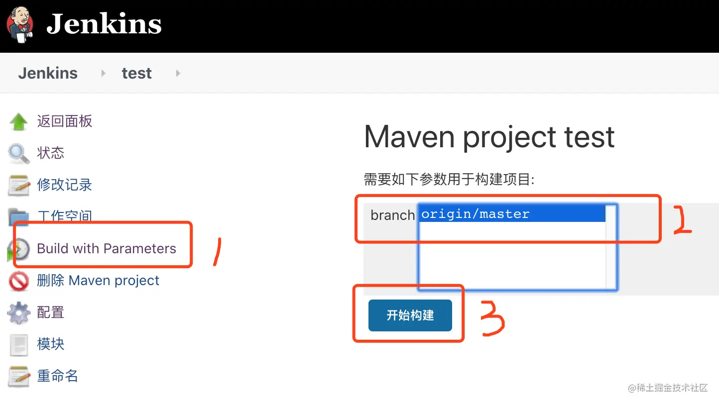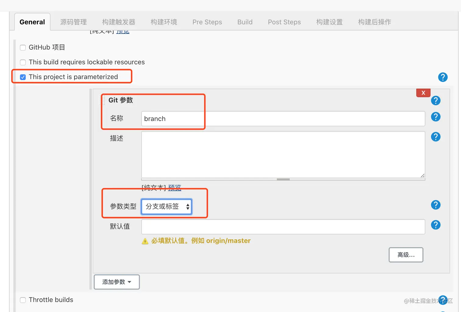 勾选参数化构建, 选择git参数, 名称填写branch , 参数类型是分支或标签