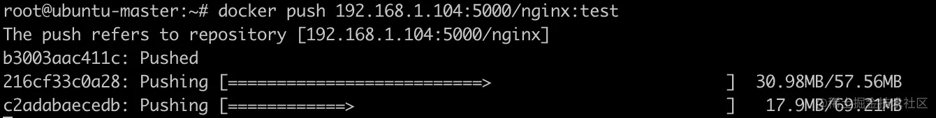 尝试把 192.168.1.104:5000/nginx:test上传到我们的Registry仓库