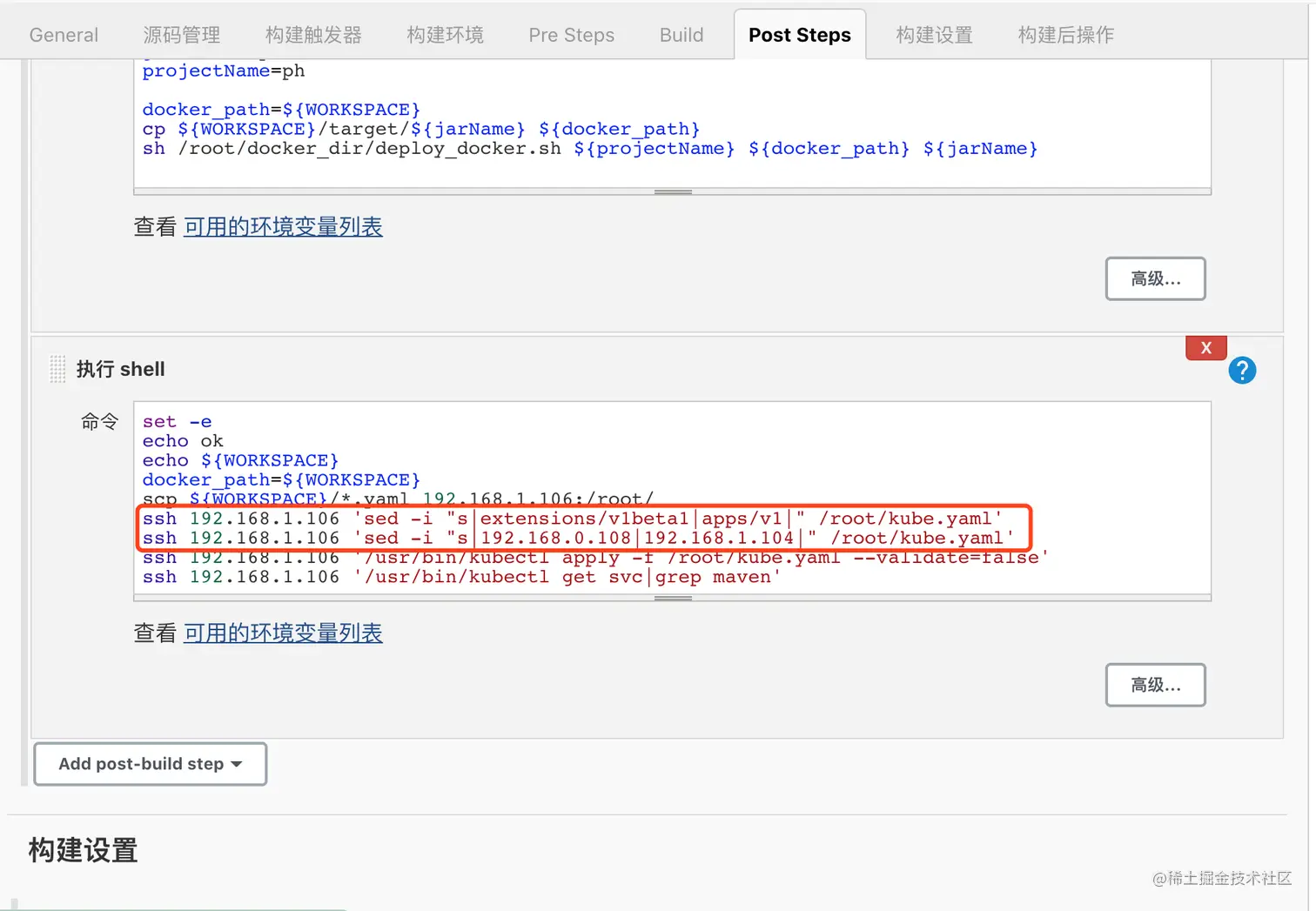 设置构建后操作, 将yaml文件拷贝到k8s master 上并运行应用