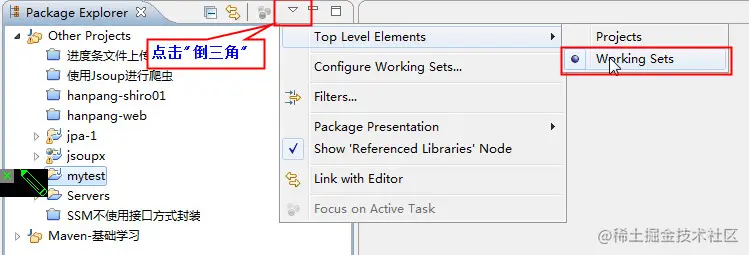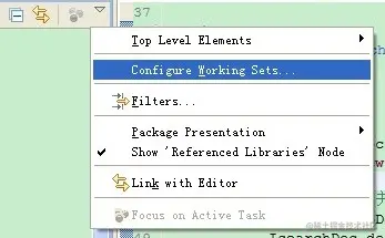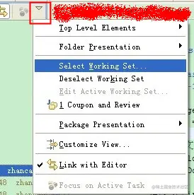 - 1.在java perspective下,点击 package explorer 的 倒三角 ,选择 Configurate Working Sets,弹出面板当中选中要修改的 working set , edit.
