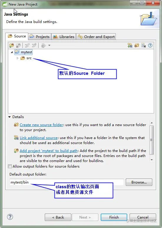 从上面可以看出来eclipse在创建一个Java Project的时候会创建一个默认的Source folder名为src,该文件夹下的所有文件经过编译之后会输出到同级的bin目录下。