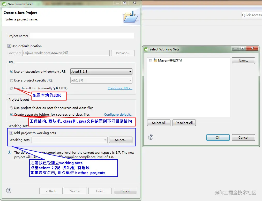 关于working set,很好理解,用来分类管理项目工程,你创建的工程主要用来做什么?属于什么类别?考虑完这两个问题你就知道放置在哪个具体的working set中了。