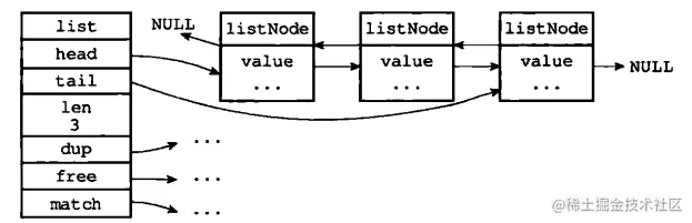 list 结构为链表提供了表头指针 head、表尾指针 tail,以及节点数量计算 len。下图展示一个由 list 结构和三个 listNode 节点组成的链表: