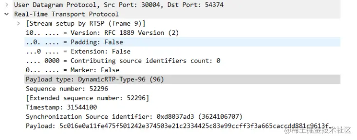 传输视频,使用的是30004端口,对应的类型96,代表为视频类型。如下图: