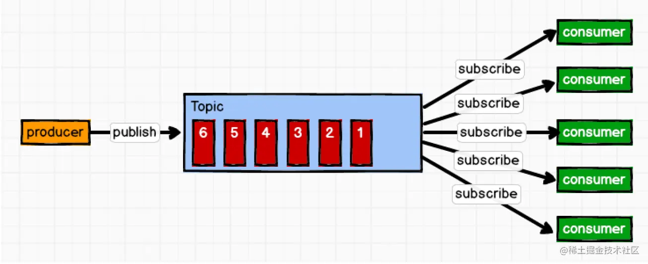 消息生产者(发布)将消息发布到topic中,同时有多个消息消费者(订阅)消费该消息。和点对点方式不同,发布到topic的消息会被所有订阅者消费。