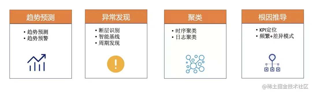 同时,提供了大量基于AI的巡检、预测、聚类、根因分析等算法,以SQL/DSL函数的形式向用户提供,在人工分析和自动巡检告警中都能使用到。